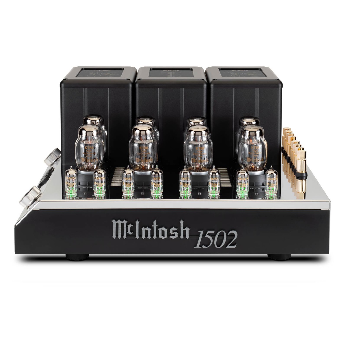 El MC1502 presenta la estética icónica de McIntosh, con un panel frontal de vidrio negro, medidores de potencia azules, y un chasis de acero inoxidable pulido que refleja la calidad y la atención al detalle que caracterizan a la marca. Las bornas de conexión son robustas y ofrecen opciones de entrada balanceada y no balanceada, lo que facilita su integración en cualquier sistema de audio de alta fidelidad. El diseño elegante y clásico del MC1502 lo convierte en una pieza central llamativa para cualquier sistema de audio premium.