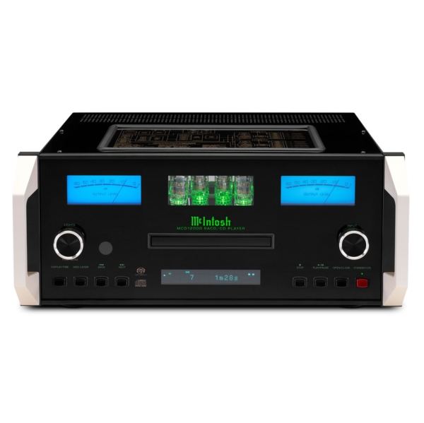 El MCD12000 presenta el icónico diseño de McIntosh, con un panel frontal de vidrio negro, medidores de nivel de salida iluminados, y un chasis de acero inoxidable pulido. También incluye salidas de audio balanceadas y no balanceadas, lo que lo hace compatible con una amplia gama de sistemas de audio de alta fidelidad. Su construcción robusta y componentes de alta calidad garantizan un rendimiento duradero y una experiencia de escucha verdaderamente excepcional.