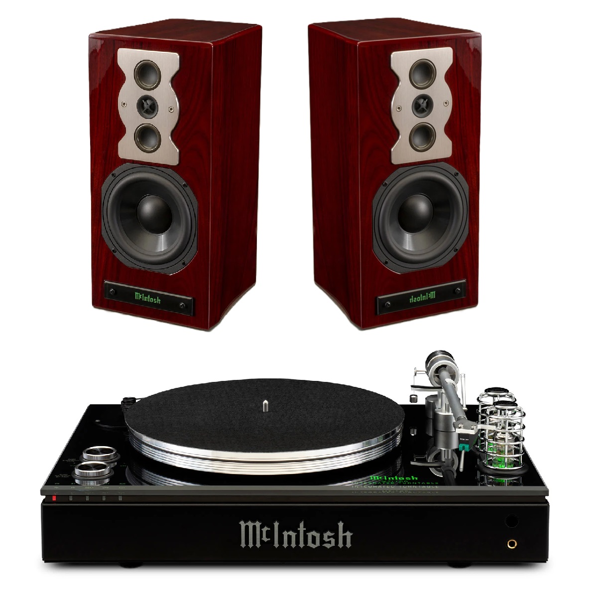 - Sistema todo en uno McIntosh MTI100 con tocadiscos, amplificador de 50 W/canal, preamplificador de válvulas y conectividad Bluetooth.